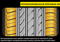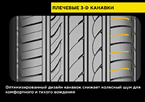Для снижения уровня колесного шума на внешней стороне протектора имеются особые закрытые канавки, за счет которых сокращаются звуковые волны. Усиливают акустический комфорт 3-Д ламели плечевой зоны и оптимизированный дизайн плечевых блоков, которые также способствуют более равномерному распределению давления в зоне контакта. Таким образом достигается максимально тихое движение и оптимальный износ протектора.