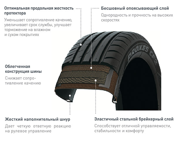 Toyo Proxes CF2 – новая летняя шина для легковых автомобилей, которая была создана с использованием инновационных разработок компании Toyo в области материалов, конструкции шины и рисунка протектора, что обеспечило высокий уровень безопасности, комфорта, износостойкости и экономии топлива.