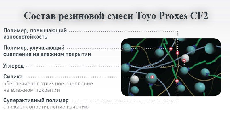 Toyo Proxes CF2 обладает рядом преимуществ. Специально разработанный рисунок протектора, новый состав резиновой смеси с высоким содержанием силики и ряд высокотехнологичных полимеров позволили снизить сопротивление качению, повысить износостойкость и улучшить сцепление на влажном покрытии.